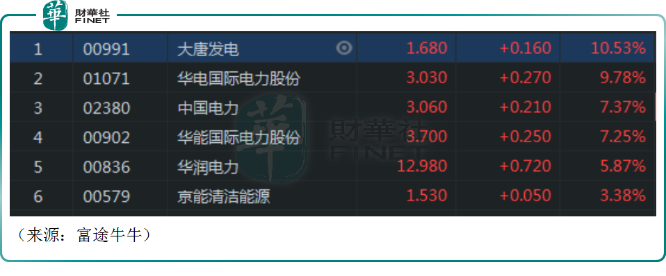 截至发稿,港股电力板块指数上涨2.14%,其中,大唐发电(00991.HK)大涨10.53%,华电国际(01071.HK)大涨9.78%,中国电力(02380.HK)大涨7.37%,华能国际(00902.HK)大涨7.25%,华润电力(00836.HK)大涨5.87%。