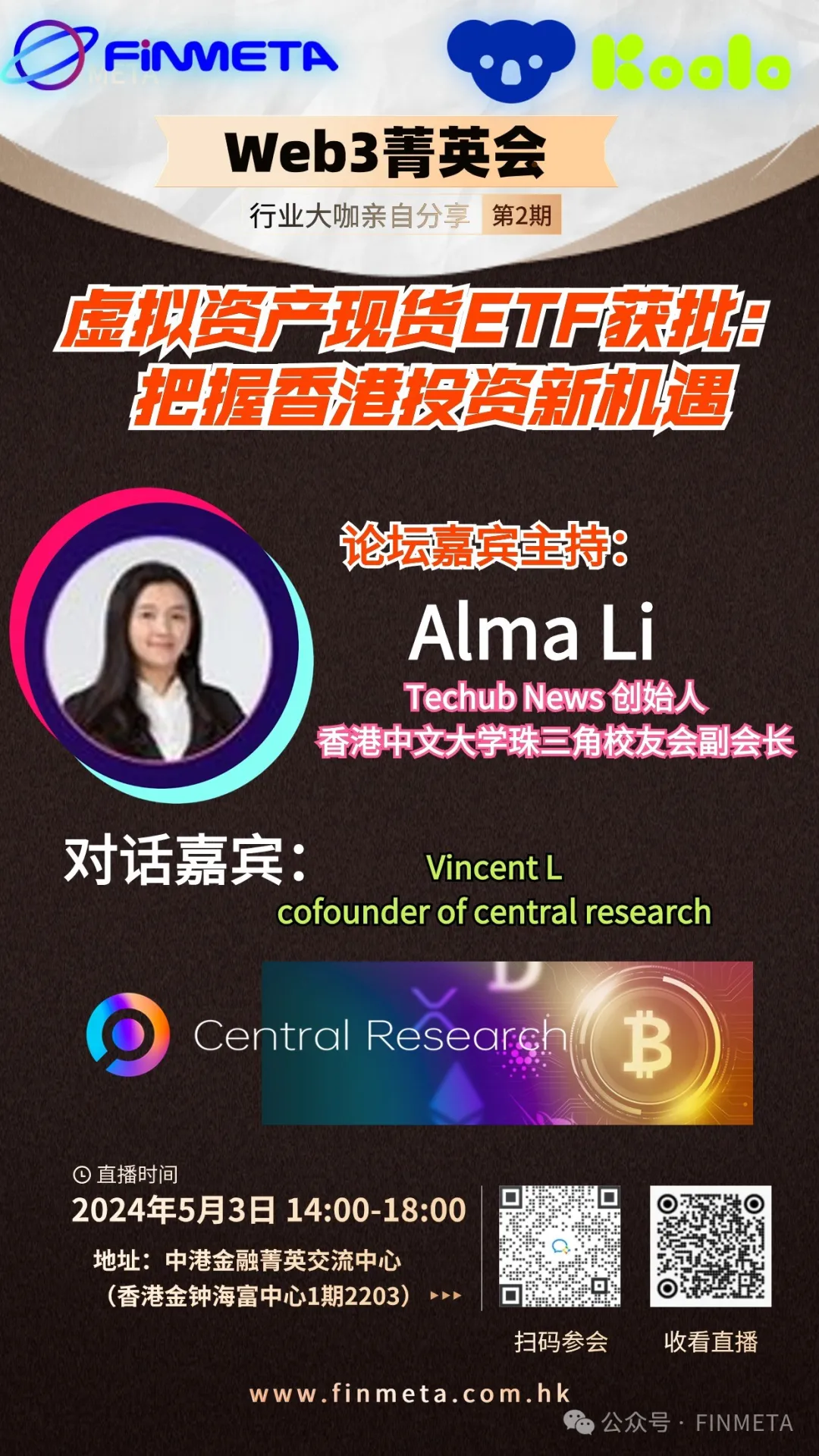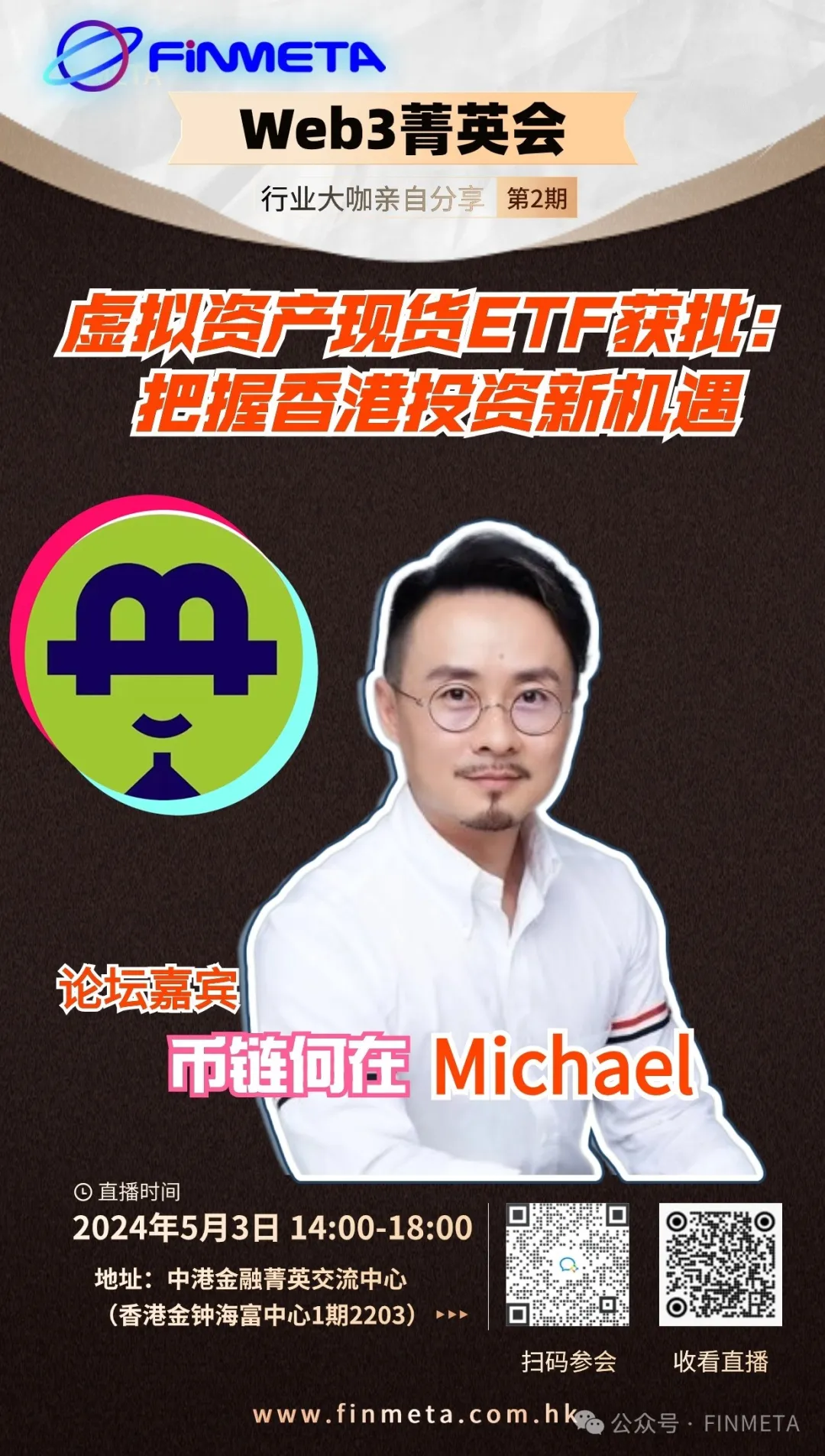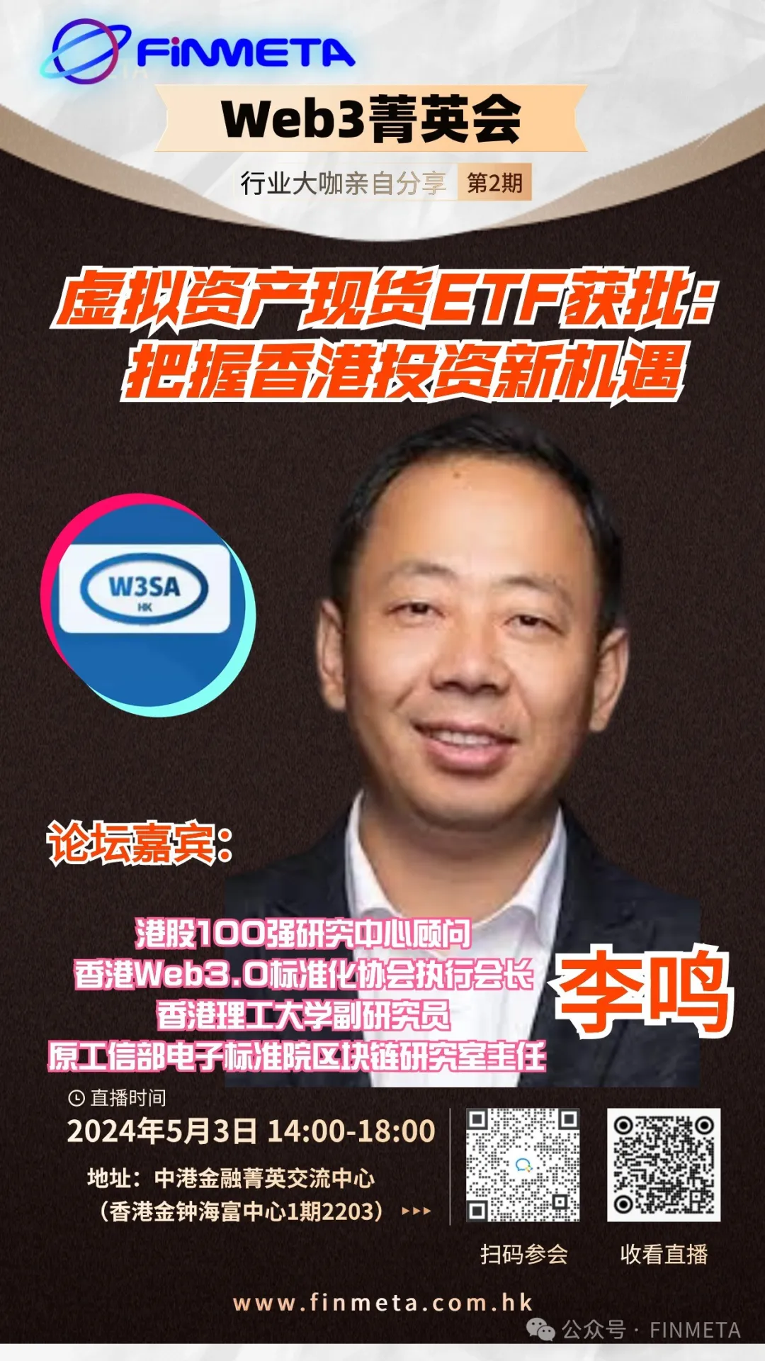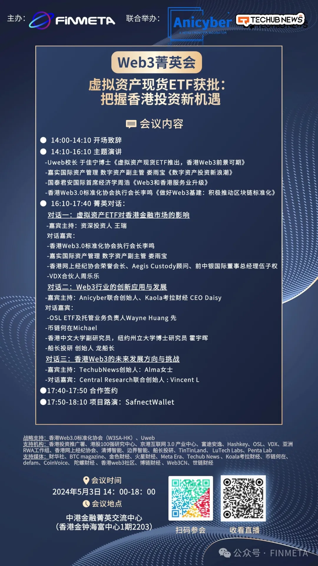 2024年5月3日,以“虚拟资产现货ETF获批:把握香港投资新机遇”为主题的Web3菁英会(第二期)在中港金融菁英交流中心(香港金钟海富中心1期2203)隆重举行。此次活动由FINMETA主办,Anicyber、Techub News联合举办。