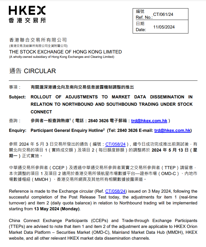 【财华社讯】5月11日,香港交易所公布,参照2024年5月3日交易所发出的通告,继今日成功完成推出前测试后,有关北向交易的项目(实时成交额)及项目(每日额度余额)的调整将于2024年5月13日(星期一)正式实施。