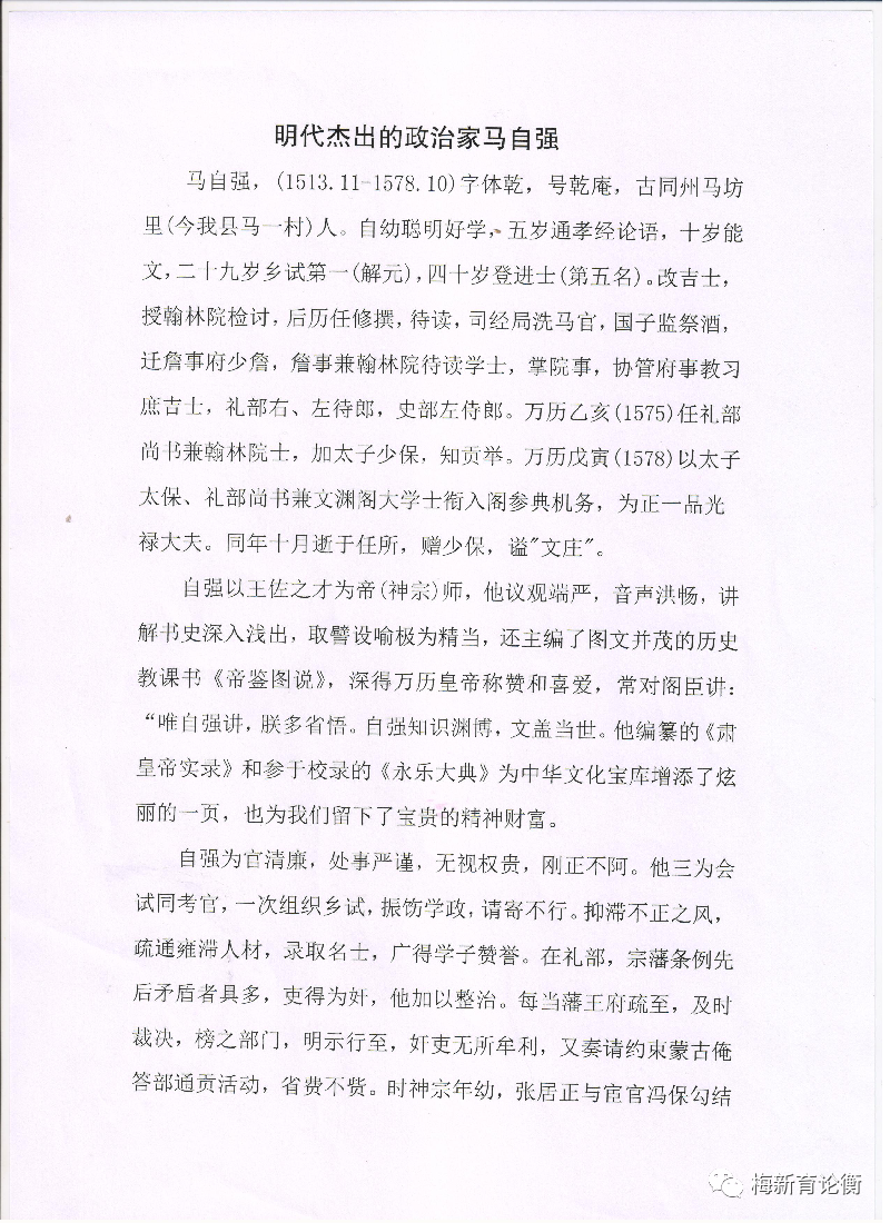 大荔县政府关于大明名臣马自强生平事迹的简介如下图: