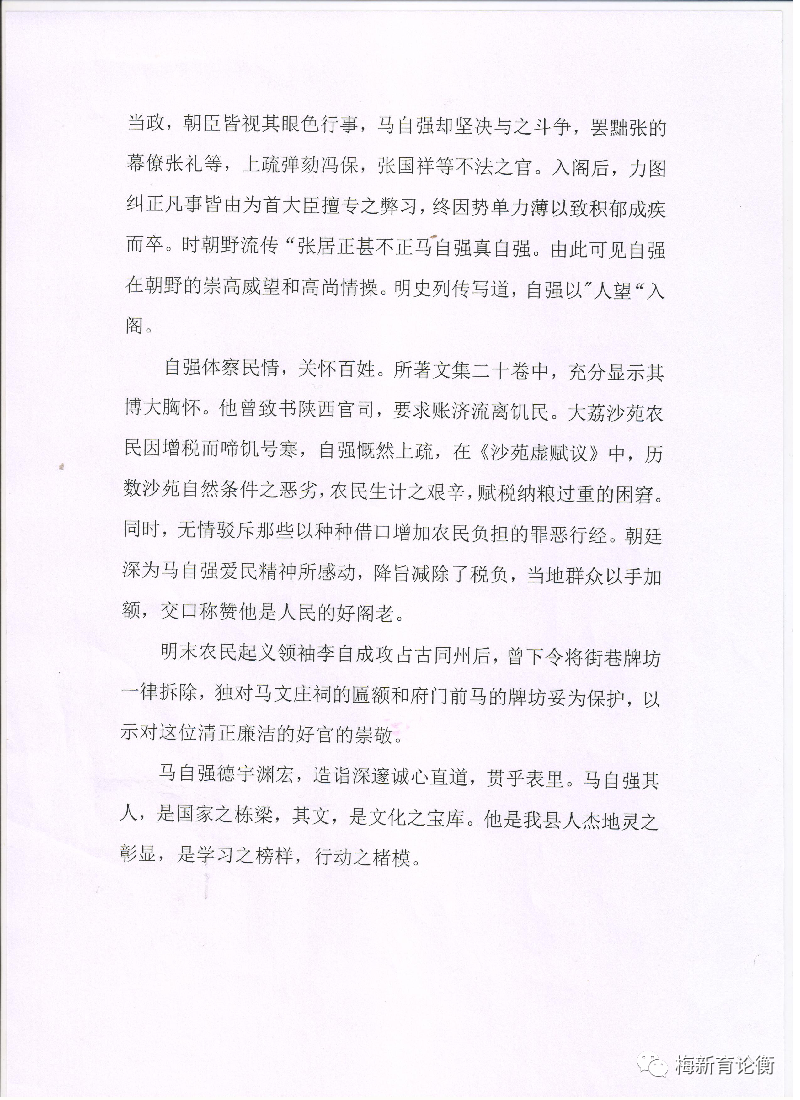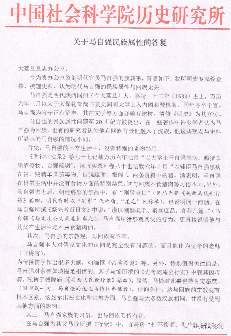 “上世纪八十年代后,社会上很多学者把我县历史名人马自强表述为回族,后来我县出版的《大荔县地名志》《大美大荔》《五彩大荔》等多部刊物中都引用了此观点,但马自强后裔及族人提出了质疑,并提供了相关证据。为此县志办进行了深入的调查研究,并函询中国社会科学院历史研究所,得出了马自强是汉族而与回族无关的结论。望我县有关单位,认真阅读信函内容,纠正错误,消除影响,吸取教训,使我县的历史文化研究与宣传工作更上一层楼,取得新的成绩。”