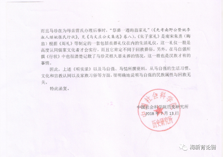 中国社会科学院历史研究所公函《关于马自强民族属性的答复》如下图: