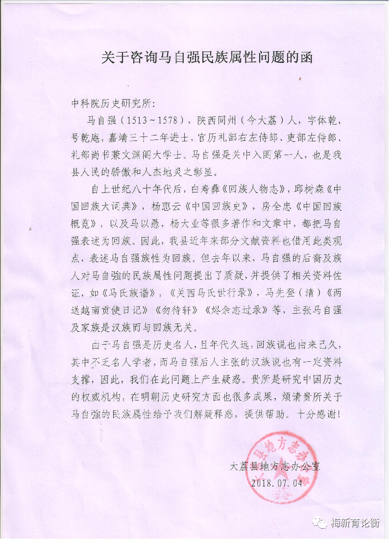 公告所附大荔县地方志办公室发给中国社会科学院历史研究所《关于咨询马自强民族属性问题的函》如下图: