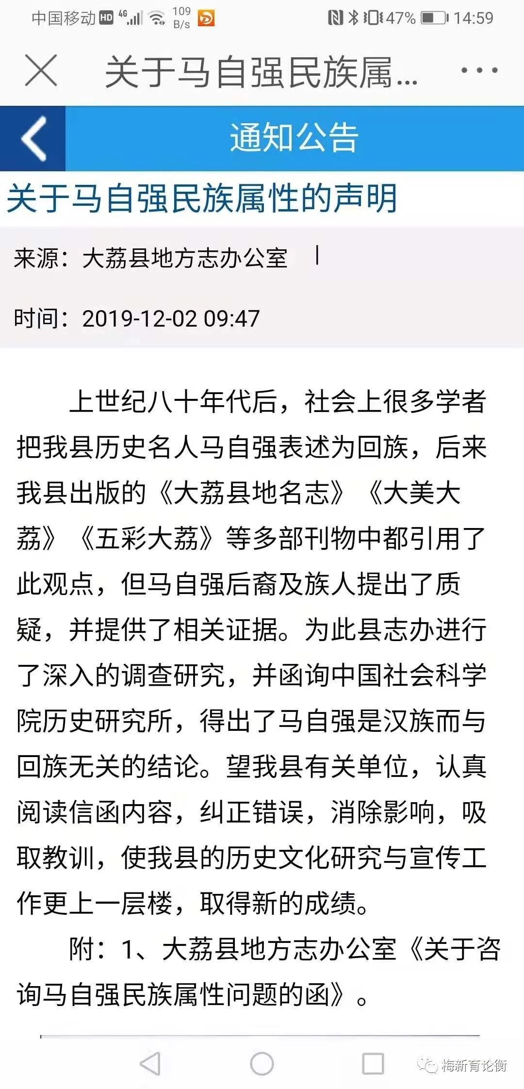 2019年12月2日,大荔县政府官方网站发布地方志办公室公告《关于马自强民族属性的声明》。一级地方政府有关机构就历史名人民族属性专门发布公告,很可能开启了中华人民共和国开国以来前所未有之先河,有可能成为历史研究和民族政策拨乱反正、进而推进国家长治久安的标志性事件。