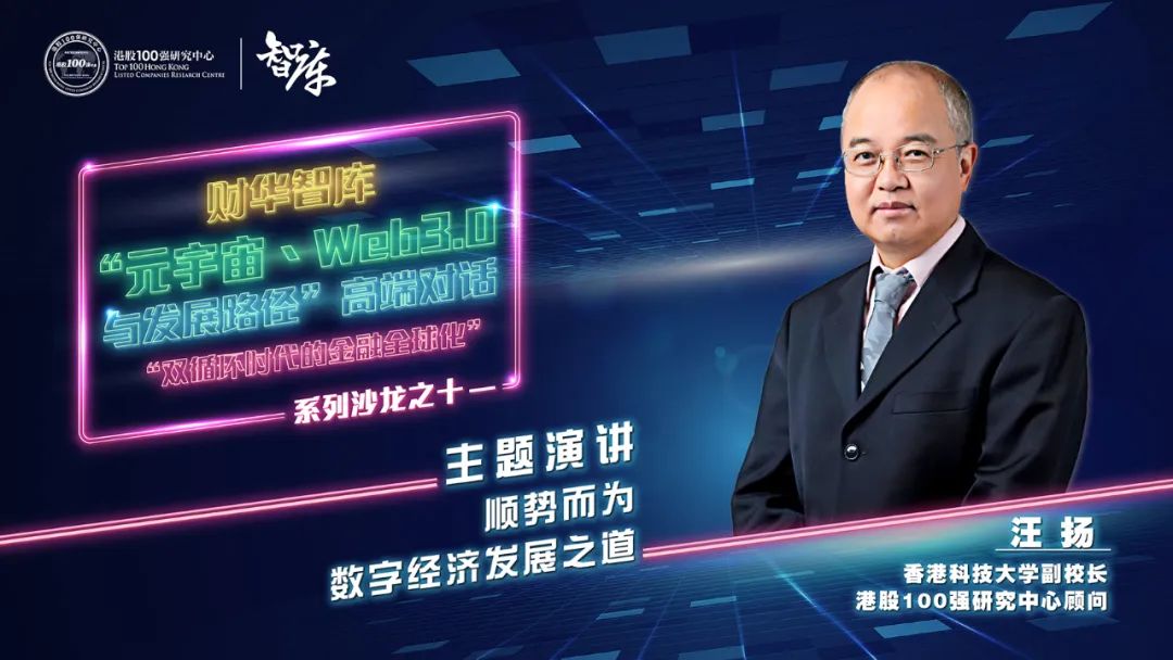 由港股100强研究中心主办、香港财华社协办的“双循环时代的金融全球化”系列沙龙第十一期“元宇宙、Web3.0与中国路径”于8月3日通过线上直播方式举行。本次活动特別邀请到香港科技大学副校长、港股100强研究中心顾问汪扬教授发表以《顺势而为,数字经济发展之道》主题的发言,以下为发言实录: