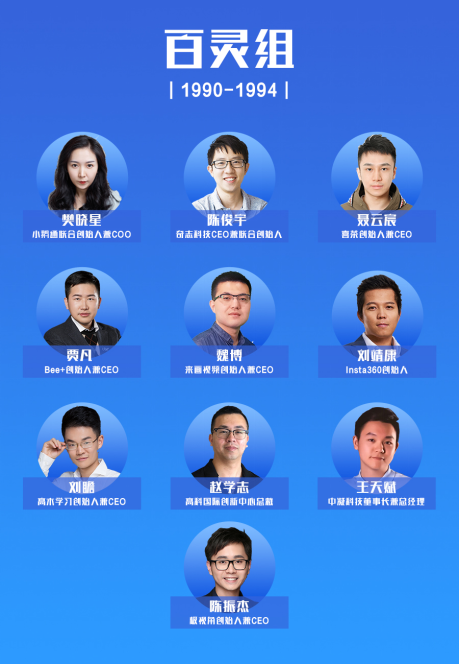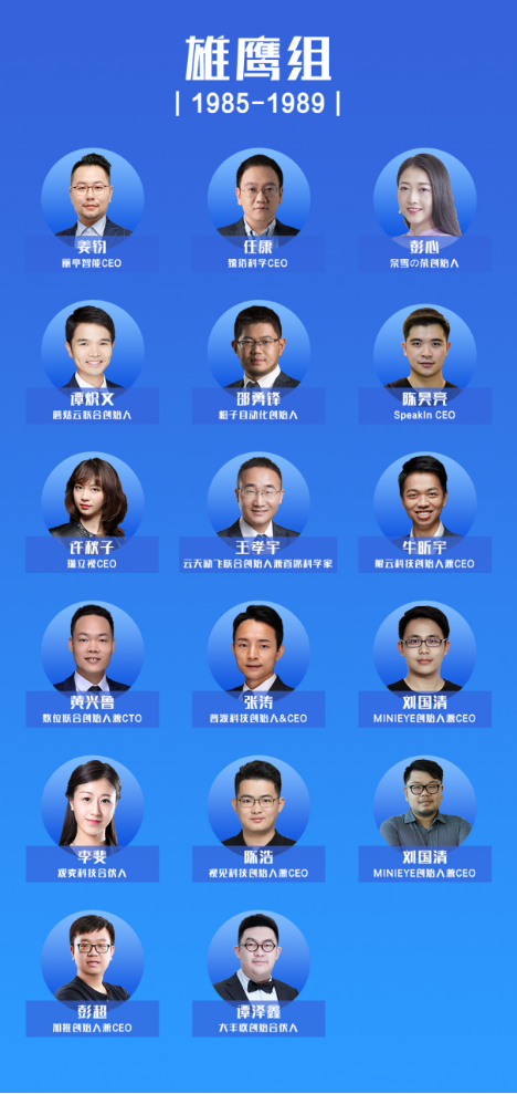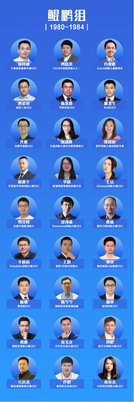 本次榜單分别選取1980年-1984年、1985年-1989年、1990年-1994年這三個年齡區間的青年創業者,分為鲲鵬組、雄鷹組、百靈組三大組,依次選出27名、17名、10名青年創業者,總計54人(諧音五四青年)。他們分别是: