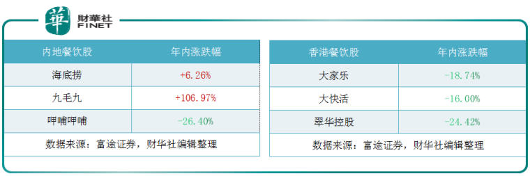 從香港交易所上市的大型連續餐飲企業於本輪疫情中表現看,年初至今,香港餐飲股股價表現較内地餐飲股弱勢。