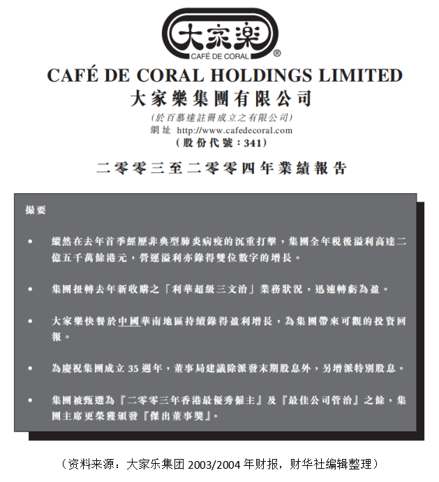 財華社記者翻看大家樂集團塵封於十六年前的2003/2004年財報。儘管財年中經歷SARS疫情,但2003/2004財年大家樂依然取得佳績,期内營業額同比增長3.9%至27.23億港元,股東應佔溢利同比增長6.3%至2.58億港元,毛利率同比增長0.72個百分點至15.46%(前值14.74%)。因時值大家樂集團成立35週年,公司甚至還派發了特别股息。