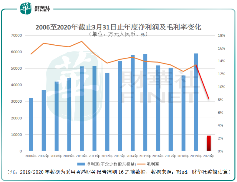 對比之下,正值新冠疫情期間的2019/2020年財報卻步步驚心。期内歸母淨利潤同比下降87.1%至7,363.4萬港元,毛利率同比下降5.2個百分點至9.2%。即使翻看Wind該公司歷史財務數據(2005/2006年後有記錄),也未見如此低迷的財務數據。鑒於業績大幅下滑,大家樂集團董事會決定不派發末期股息,此為該公司1986年上市以來首次停止派息。