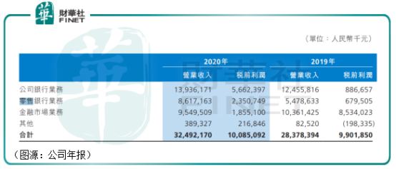 2020年渤海銀行三大業務分部公司銀行、零售銀行及金融市場分部分别貢獻收入139.36億、86.17億元及95.50億元,佔總收入比例分别為42.89%、26.52%及29.39%,同比分别增長11.88%、57.29%及-7.84%。在各大主要業務分部中,資產風險權重普遍較低的零售銀行分部過去四年快速增長。