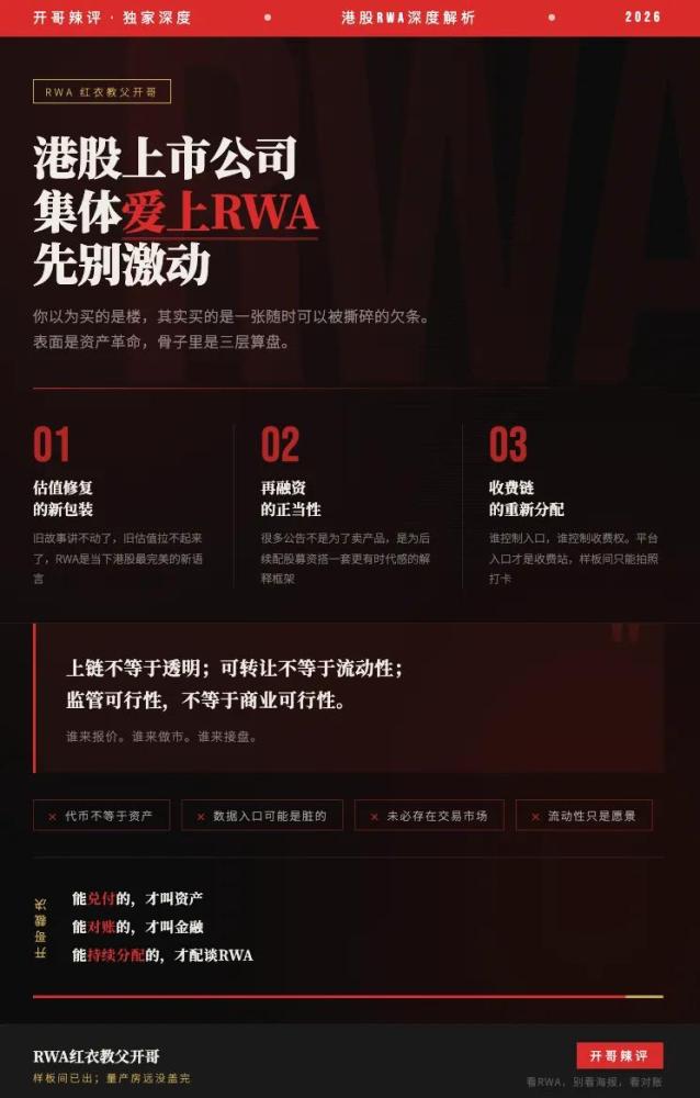 RWA紅衣教父開哥說透一件事:今天很多上市公司做RWA,表面上是在講資產上鏈,骨子里是在找估值、找融資、找新收費權,順手再給自己換一套更像未來的資本叙事。