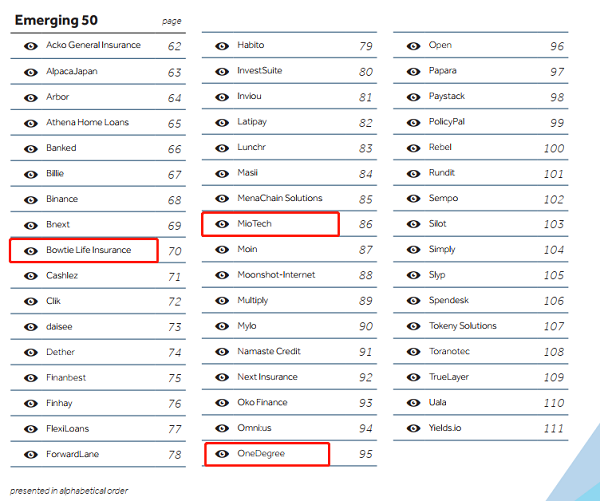 柒財經梳理發現,新興50強榜單中共有3家中國企業,在香港獲得首張虛擬保險牌照的保泰人壽(Bowtie Life Insurance)、資産管理智能系統提供商妙盈科技(MioTech)、香港互聯網寵物保險公司OneDegree均進入「新興50強」榜單。