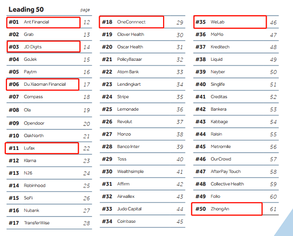 根據報告,Fintech100收納了50家全球領先的金融科技公司(2019金融科技企業前50強)和50家「新興50強」金融科技企業。在金融科技企業50強榜單中,柒財經旗下柒財經發現,中國共有10家金融科技公司或科技企業上榜,包括螞蟻金服、京東數科、上市公司衆安在線(06060.HK)等。