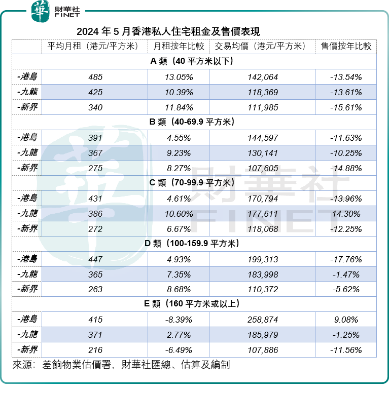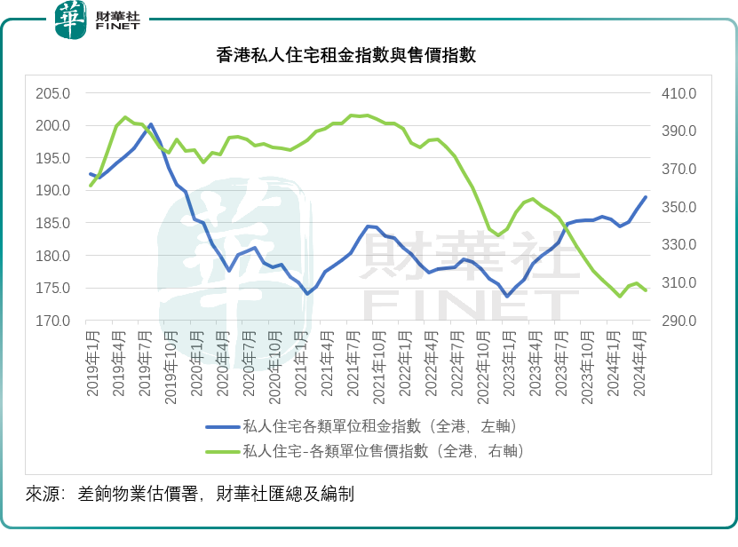 差饷物價估價署的最新數據顯示,2024年5月份私人住宅各類單位租金指數由上個月的187.1點進一步提高至189.0點,也較上年同期上升9.1點;然而,私人住宅單位售價指數卻進一步下降,由上個月的309.7點下降至305.9點,較上年同期下降了44.5點。