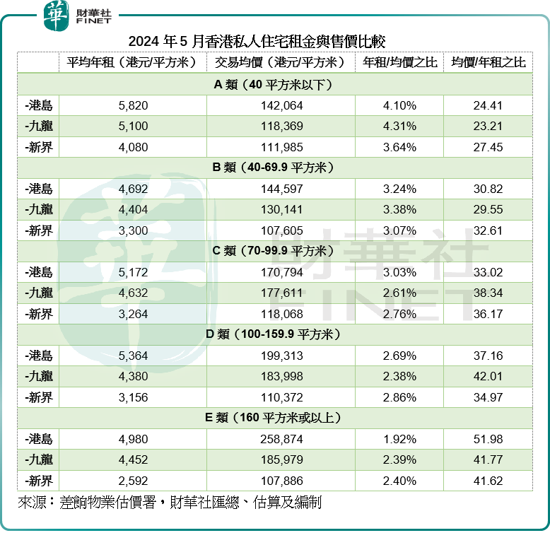 從私人住宅類别來看,小面積住宅的租金和售價更為敏感。於2024年5月,40平方米以下的A類住宅,平均月租按年增幅均達到雙位數,而平均售價跌幅則達到13%-15%區間,售價的跌幅仍遠高於月租升幅。其中港島區的月租升幅最大,達到13%以上。