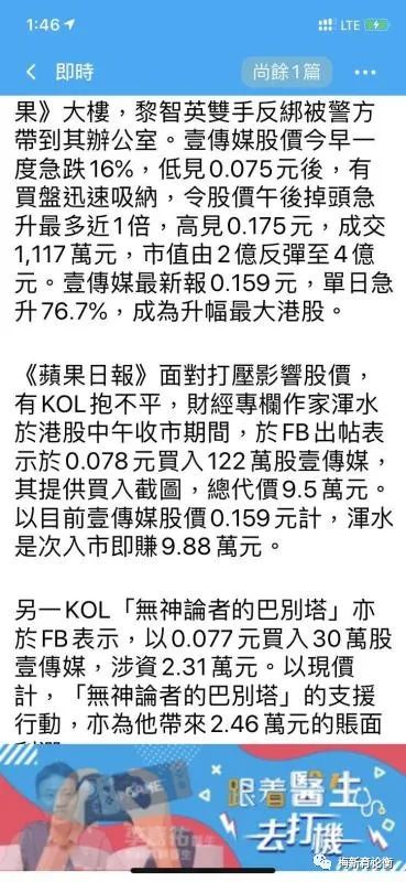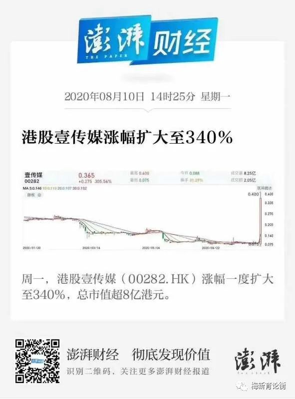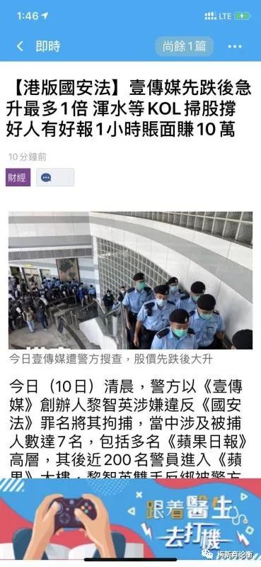 黎智英父子三人和壹傳媒兩個頭頭張劍虹、周達權被捕,馬克·西蒙(Mark Simon)被通緝,警方今天上午搜查壹傳媒辦公樓,港區國安法執法亮出鐵拳。在這種情況下,壹傳媒這只香港股市著名垃圾股今天居然大有“垃圾升天”之勢,成交量和股價雙雙暴漲,這只平時基本無人問津的垃圾股在一小時内轉手量接近公司總股份三分之一,漲幅至午後先是擴大到200%,接著進一步擴大至340%。
